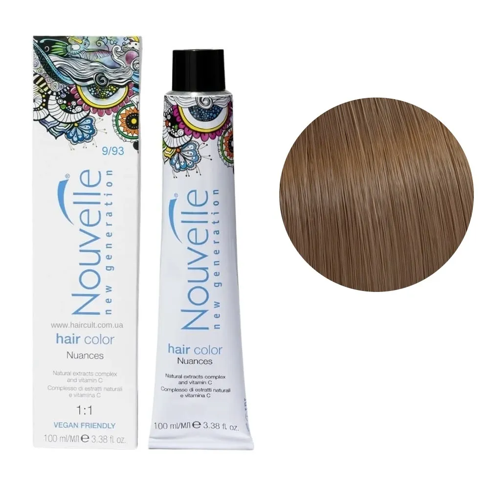 Nouvelle New Generation Hair Color - це стійка аміачна крем-фарба для волосся, яка забезпечує насичений, тривалий колір і професійний результат. Продукт пропонує широку палітру, що включає натуральні, яскраві, модні та ультрасвітлі тони. Особливості продукту: 9/93 дуже світлий пісочно-золотистий блондин Фарба для волосся перманентна, 100мл Permanent Hair Color Nouvelle Застосування: 9/93 дуже світлий пісочно-золотистий блондин Фарба для волосся перманентна, 100мл Permanent Hair Color Nouvelle Фарбу змішують із окислювачем Nouvelle Developer Cream Peroxide (1,5%, 3%, 6%, 9% або 12%) у відповідних пропорціях залежно від бажаного ефекту: тонування, освітлення чи зафарбовування сивини. Суміш наноситься на сухе, немите волосся із витримкою 25-50 хвилин, залежно від інтенсивності кольору. Після фарбування рекомендується використовувати шампунь і доглядові засоби з серії Nouvelle Color Glow для збереження кольору і здоров’я волосся.Фарба для волосся перманентна Permanent Hair Color Nouvelle