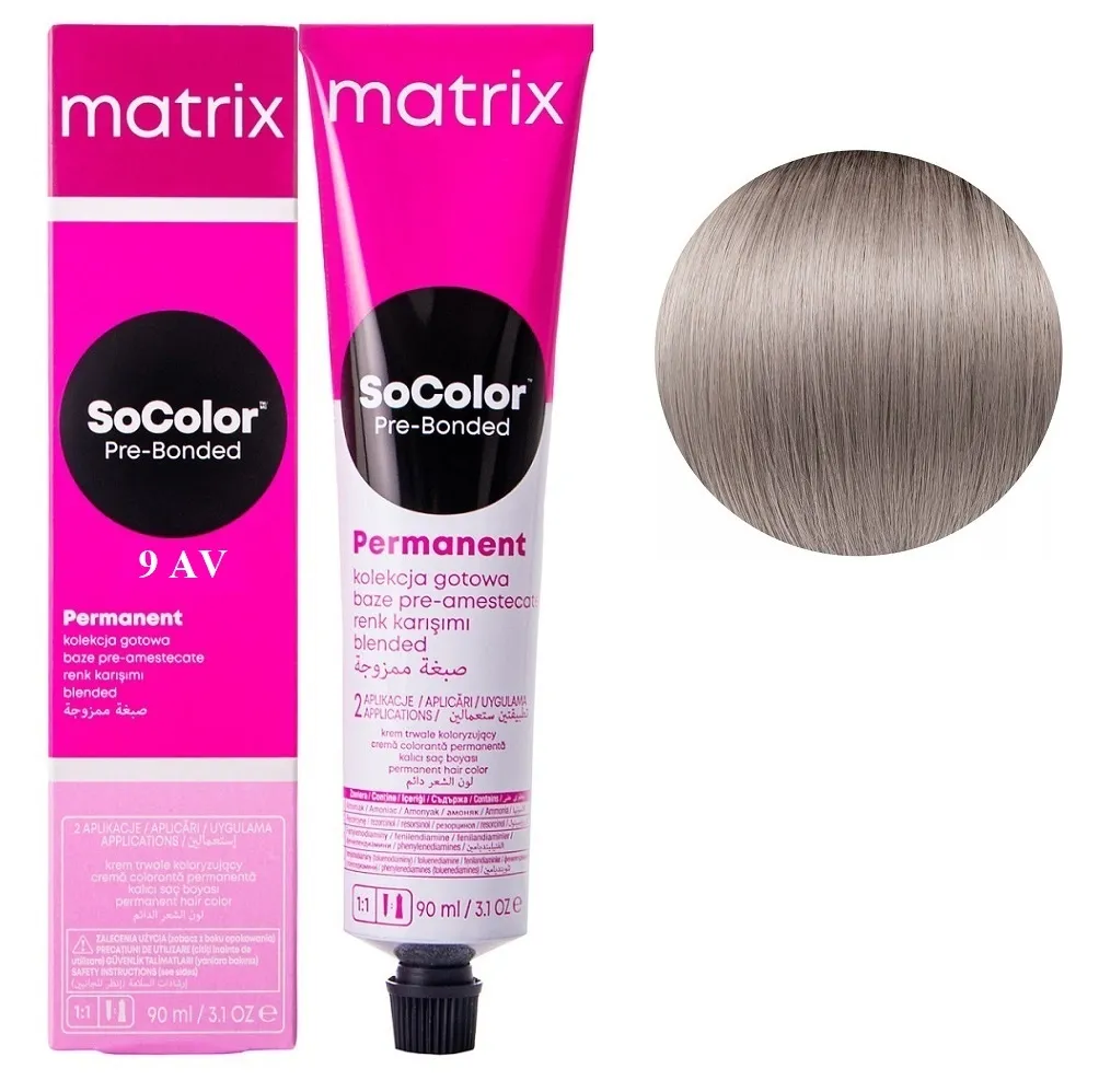 SoColor Pre-Bonded Cream Permanent- це оновлена версія легендарної фарби від бренду MATRIX, яка поєднує інтенсивний колір, тривалу стійкість та інноваційний догляд. Завдяки сучасній формулі з технологією Pre-Bonded фарба одночасно дарує насичений відтінок і зміцнює внутрішні зв’язки волосся, запобігаючи ламкості та пошкодженням у процесі фарбування. Особливості продукту: 9AV дуже світлий блондин попелястий фіолетовий Крем-фарба для волосся, 90 мл SoColor Pre-Bonded MATRIX (оновлений дизайн) SoColor Pre-Bonded містить компоненти, які відновлюють структуру волосини та зберігають природний рівень зволоження. Завдяки цьому після фарбування волосся виглядає м’яким, блискучим і доглянутим. Застосування: 9AV дуже світлий блондин попелястий фіолетовий Крем-фарба для волосся, 90 мл SoColor Pre-Bonded MATRIX (оновлений дизайн) Фарба SoColor Pre-Bonded MATRIX змішується з окисником Matrix Cream Developer у пропорції 1:1. Концентрація обирається в залежності від колористичної задачі. Суміш наноситься на сухе немите волосся. Час витримки: 35–45 хвилин залежно від базового кольору та бажаного результату. Після завершення процесу фарбування волосся ретельно промити водою до прозорості, нанести шампунь для фарбованого волосся та завершити догляд кондиціонером або маскою. Результат: Ви отримуєте стійкий, глибокий і блискучий колір, який зберігається тривалий час. Навіть після багаторазового миття голови відтінок виглядає свіжим, а волосся залишається еластичним і сильним. SoColor Pre-Bonded MATRIX - це вибір професіоналів, які прагнуть дарувати клієнтам ідеальний колір та дбати про здоров’я волосся під час фарбування.Крем-фарба для волосся SoColor Pre-Bonded Cream Permanent MATRIX