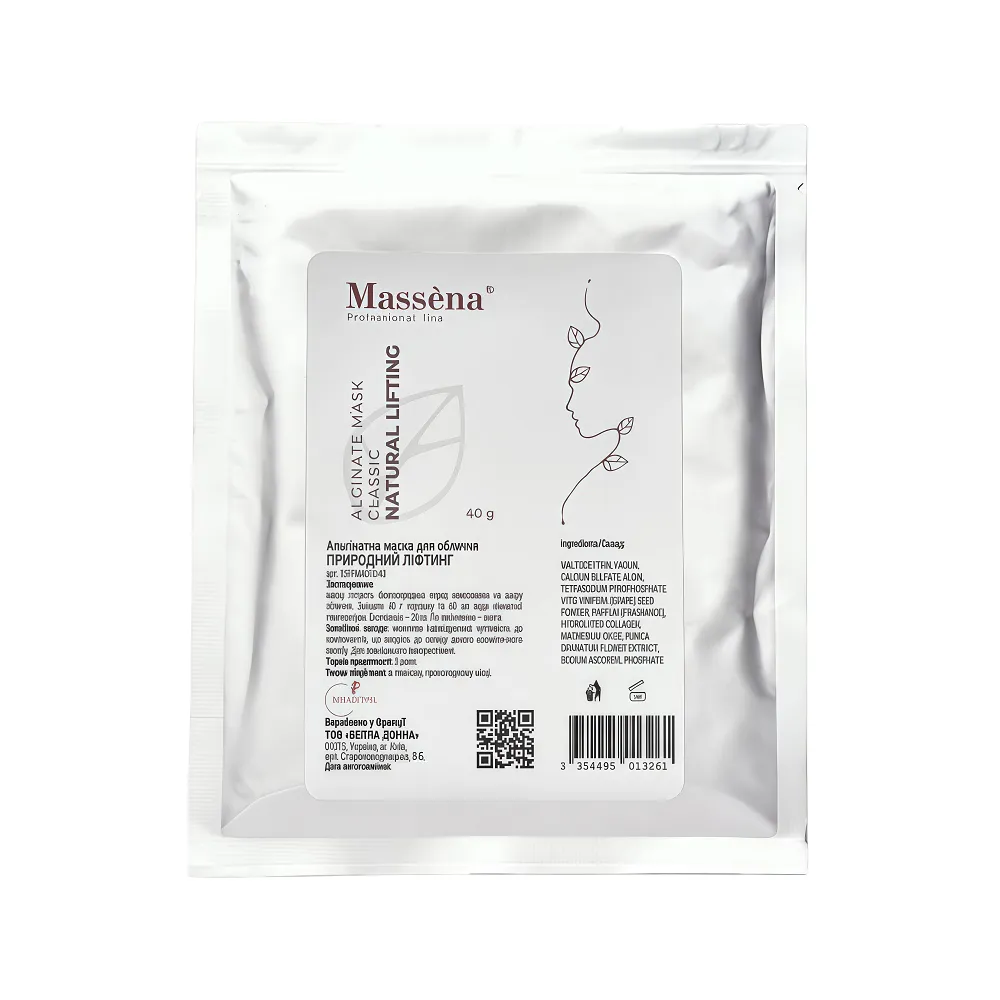 Ліфтинг природний NATURAL LIFTING альгінатна маска – це продукт для тих, хто прагне забезпечити своїй шкірі професійний догляд з вираженим ліфтинговим ефектом. Завдяки синергії природних компонентів, маска забезпечує глибоке зволоження, відновлює водний баланс шкіри, заспокоює подразнення та знімає почервоніння. Маска ідеально підходить для програм корекції контурів обличчя, забезпечує тонізувальний та підтягувальний ефект. Особливості продукту: Альгінатна маска для обличчя (САШЕ) "Ліфтинг природний", 40 г NATURAL LIFTING Classic Alginate Mask Massena Активні компоненти: Альгінатна маска для обличчя (САШЕ) "Ліфтинг природний", 40 г NATURAL LIFTING Classic Alginate Mask Massena Застосування: Альгінатна маска для обличчя (САШЕ) "Ліфтинг природний", 40 г NATURAL LIFTING Classic Alginate Mask MassenaАльгінатна маска для обличчя "Ліфтинг природний" NATURAL LIFTING Classic Alginate Mask Massena