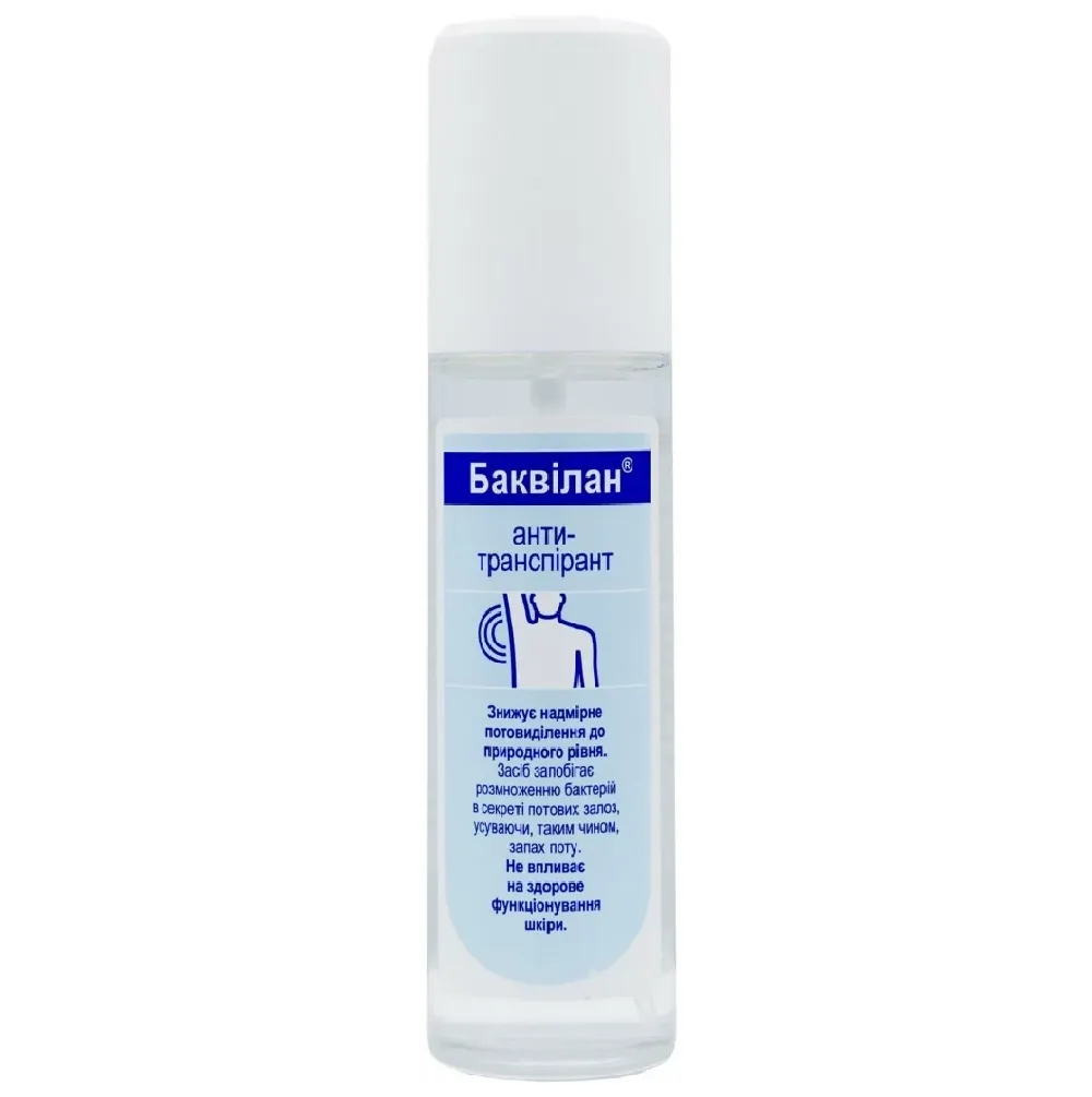 Дія: «БАКВІЛАН анти-транспірант»: Рекомендації щодо застосування: Спосіб застосування: Склад: Алюміній хлористий, 1,5-пентадіол, вода демінералізована.Антиперспірант спрей Баквілан анти-транспірант