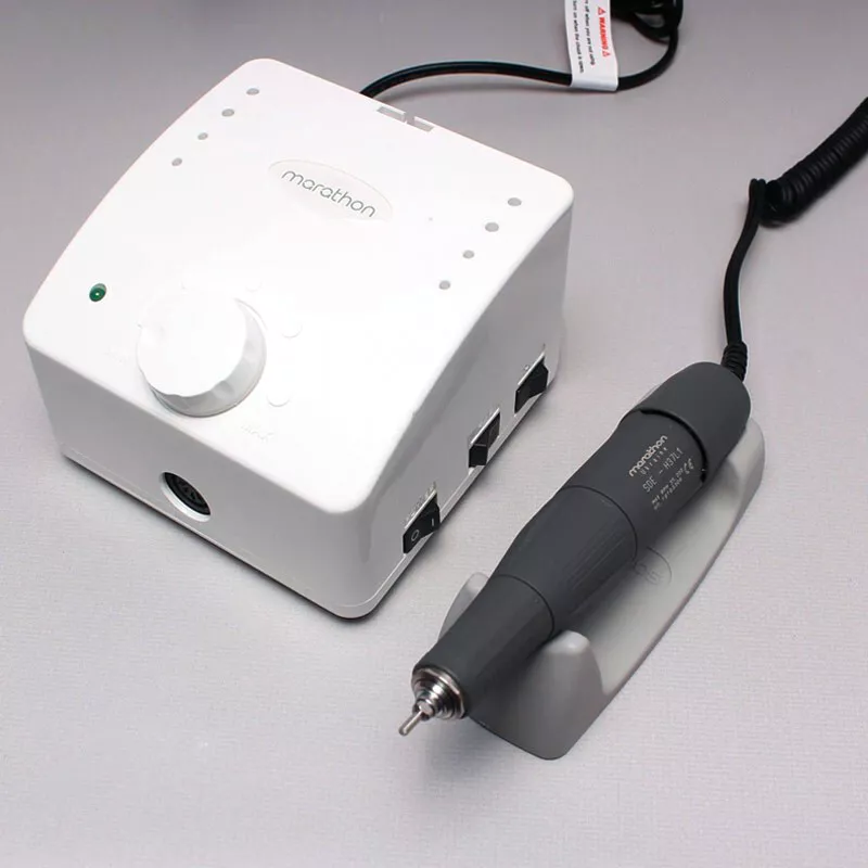 Це надійний пристрій у сфері краси. Апарат Marathon Куб K35 за всіма параметрами ідентичний фрезеру Marathon Champion-3, за винятком зовнішнього оформлення. Потужність фрезера 45 Вт дозволяє швидко та якісно проводити необхідні процедури, а його тиха робота без зайвого шуму та вібрацій забезпечує комфорт як майстру, так і клієнту. Він ідеально підходить для проведення апаратного манікюру, корекції та комбінованого педикюру. Це ідеальний вибір для майстрів манікюру, які цінують свою роботу. На передній панелі розташоване управління швидкістю та роз`єм для ручки, а праворуч знаходяться кнопки включення/вимкнення та реверсу. Позаду є кнопка з педаллю для перемикання режиму роботи та відповідний роз`єм. Ручка-мікромотор H37L1 розвиває швидкість до 35000 об./хв. Замок Twist-Lock забезпечує швидку зміну фрези. Під час роботи ручка постійно обдувається, що забезпечує охолодження двигуна, захищаючи його від перегріву та продовжуючи термін служби. Вона має ідеальну фіксацію мікромотора в руці. Для підтвердження оригінальності на ручці зазначено маркування "Ukraine". Тільки ручки з цим позначенням були офіційно імпортовані в Україну та пройшли повну сертифікацію. При купівлі фрезера на нашому сайті Hair Cult ви можете бути впевнені в його оригінальності.Фрезер Saeyang Marathon Cube K35 з ручкою H37L1
