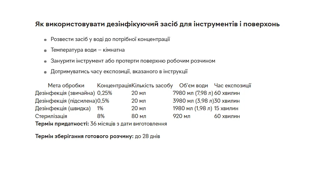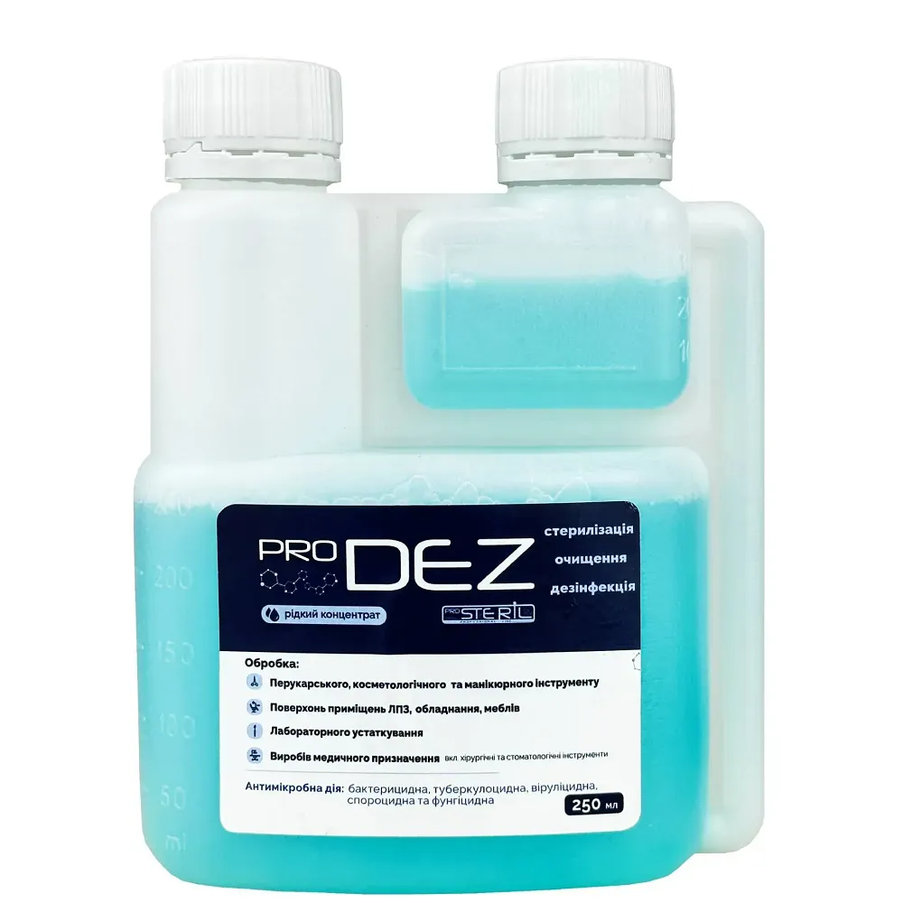 ProDez – це високоефективний дезінфекційний засіб (КОНЦЕНТРАТ), спеціально розроблений для закладів, де важливо забезпечити максимальну стерильність. Завдяки потужній формулі, він ефективно знищує бактерії, віруси, грибки та інші патогени, забезпечує тривалий захист поверхонь та інструментів. Формула розроблена з урахуванням вимог сучасної дезінфекції, забезпечує антимікробну дію 5 в 1. Підходить для дезінфекції медичних інструментів, меблів, обладнання та поверхонь. Не містить агресивних компонентів, які можуть викликати корозію або пошкодження матеріалів. Особливості продукту: Концентрат рідкий для дезінфекції, передстерилізаційного очищення і стерилізації, 250 мл ProDez ProSTERIL Застосування: Концентрат рідкий для дезінфекції, передстерилізаційного очищення і стерилізації, 250 мл ProDez ProSTERIL Ідеальний для використання у медичних закладах, стоматологіях, лабораторіях, фармацевтичних підприємствах, ветеринарних клініках та інших місцях, де необхідна стерильність. Може застосовуватися як для миття поверхонь, так і для дезінфекції інструментів. Має зручну дозувальну камеру (30 мл) у флаконах 250 мл та 1000 мл, яка допоможе точно підготувати розчин до використання. Приготування робочого розчину вказане на самій етикетці!Концентрат рідкий для дезінфекції, передстерилізаційного очищення і стерилізації ProDez ProSTERIL