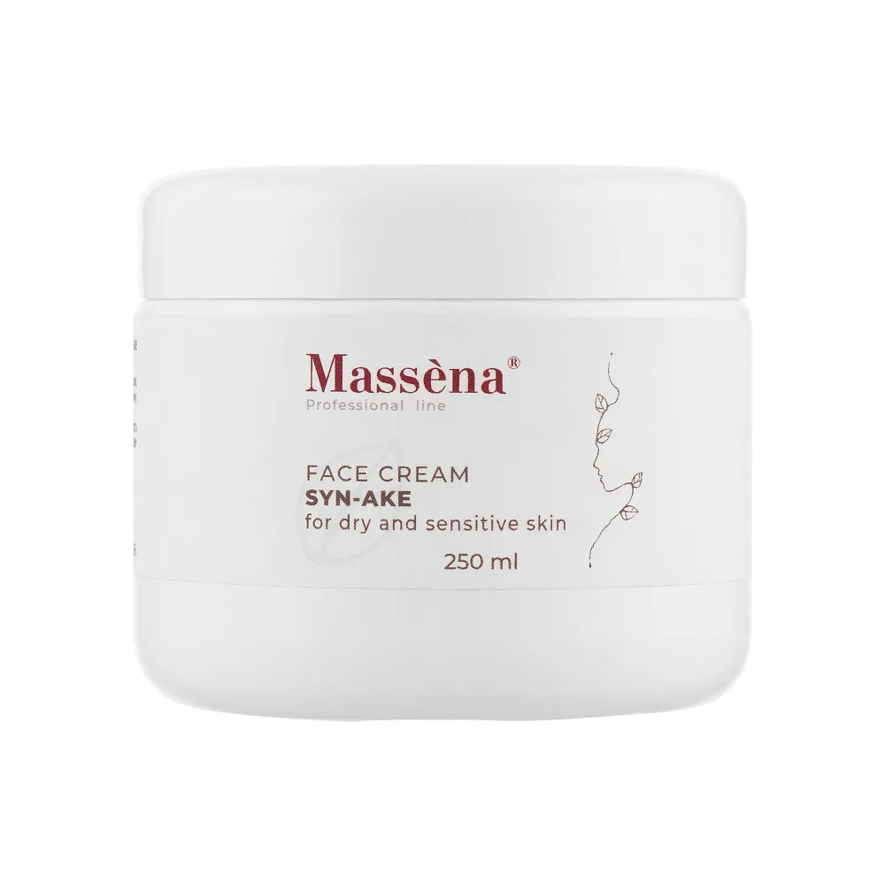 Крем для обличчя SYN-AKE - це ідеальний засіб для тих, хто шукає не тільки глибоке зволоження, але і видимий антивіковий ефект. Завдяки інноваційним інгредієнтам, зокрема трипептиду SYN-AKE, цей крем допомагає розгладити зморшки, повернути шкірі пружність та запобігти передчасному старінню. Особливості продукту: Крем для обличчя сухої та чутливої шкіри, 250 мл SYN-AKE Face Cream Massena Активні компоненти: Крем для обличчя сухої та чутливої шкіри, 250 мл SYN-AKE Face Cream Massena Застосування: Крем для обличчя сухої та чутливої шкіри, 250 мл SYN-AKE Face Cream MassenaКрем для обличчя сухої та чутливої шкіри SYN-AKE Face Cream Massena