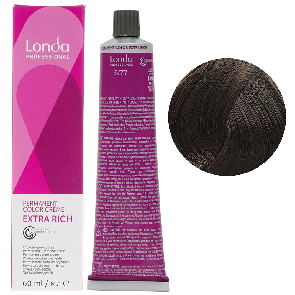 Стійка крем-фарба з мікросферами Vitaflection, які відбивають світло, для стійкого, насиченого життєвою енергією кольору і виняткового блиску волосся. Забезпечує тривалий результат – завдяки спеціальній технології фарба глибоко проникає у структуру волосся, забезпечує інтенсивний колір до 8 тижнів. Має широку палітру понад 100 відтінків для будь-якого типу та кольору волосся. Особливості продукту: 5/77 світлий брюнет інтенсивно-коричневий Стійка фарба для волосся, 60 мл Permanent Color Londa Professional Фарба має престижну систему ароматів з високоякісним маскуванням аміаку, що робить фарбування більш приємним досвідом для вашого клієнта. Застосування: 5/77 світлий брюнет інтенсивно-коричневий Стійка фарба для волосся, 60 мл Permanent Color Londa Professional Змішати фарбу Permanent Color з окислювачем Permanent Hair Colour Developer Londacolor 3%, 6%, 9% або 12%. Пропорції змішування: Час витримки залежить від бажаного результату. Важливо! Продукт для професійного застосування. Уважно ознайомтесь з інструкцією.Стійка фарба для волосся Permanent Color Londa Professional