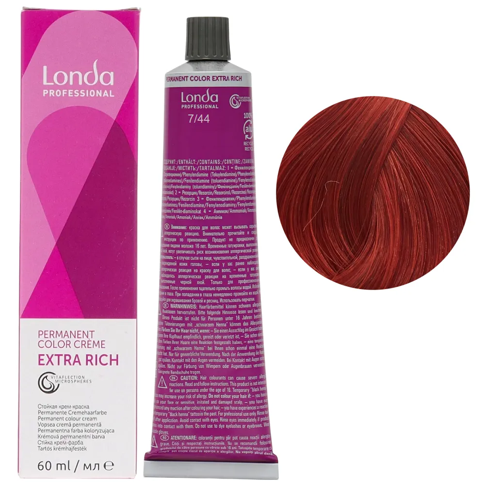 Стійка крем-фарба з мікросферами Vitaflection, які відбивають світло, для стійкого, насиченого життєвою енергією кольору і виняткового блиску волосся. Забезпечує тривалий результат – завдяки спеціальній технології фарба глибоко проникає у структуру волосся, забезпечує інтенсивний колір до 8 тижнів. Має широку палітру понад 100 відтінків для будь-якого типу та кольору волосся. Особливості продукту: 7/44 середній блондин інтенсивно-мідний Стійка фарба для волосся, 60 мл Permanent Color Londa Professional Фарба має престижну систему ароматів з високоякісним маскуванням аміаку, що робить фарбування більш приємним досвідом для вашого клієнта. Застосування: 7/44 середній блондин інтенсивно-мідний Стійка фарба для волосся, 60 мл Permanent Color Londa Professional Змішати фарбу Permanent Color з окислювачем Permanent Hair Colour Developer Londacolor 3%, 6%, 9% або 12%. Пропорції змішування: Час витримки залежить від бажаного результату. Важливо! Продукт для професійного застосування. Уважно ознайомтесь з інструкцією.Стійка фарба для волосся Permanent Color Londa Professional