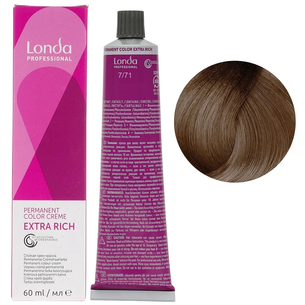 Стійка крем-фарба з мікросферами Vitaflection, які відбивають світло, для стійкого, насиченого життєвою енергією кольору і виняткового блиску волосся. Забезпечує тривалий результат – завдяки спеціальній технології фарба глибоко проникає у структуру волосся, забезпечує інтенсивний колір до 8 тижнів. Має широку палітру понад 100 відтінків для будь-якого типу та кольору волосся. Особливості продукту: 7/71 середній блондин коричнево-попелястий Стійка фарба для волосся, 60 мл Permanent Color Londa Professional Фарба має престижну систему ароматів з високоякісним маскуванням аміаку, що робить фарбування більш приємним досвідом для вашого клієнта. Застосування: 7/71 середній блондин коричнево-попелястий Стійка фарба для волосся, 60 мл Permanent Color Londa Professional Змішати фарбу Permanent Color з окислювачем Permanent Hair Colour Developer Londacolor 3%, 6%, 9% або 12%. Пропорції змішування: Час витримки залежить від бажаного результату. Важливо! Продукт для професійного застосування. Уважно ознайомтесь з інструкцією.Стійка фарба для волосся Permanent Color Londa Professional