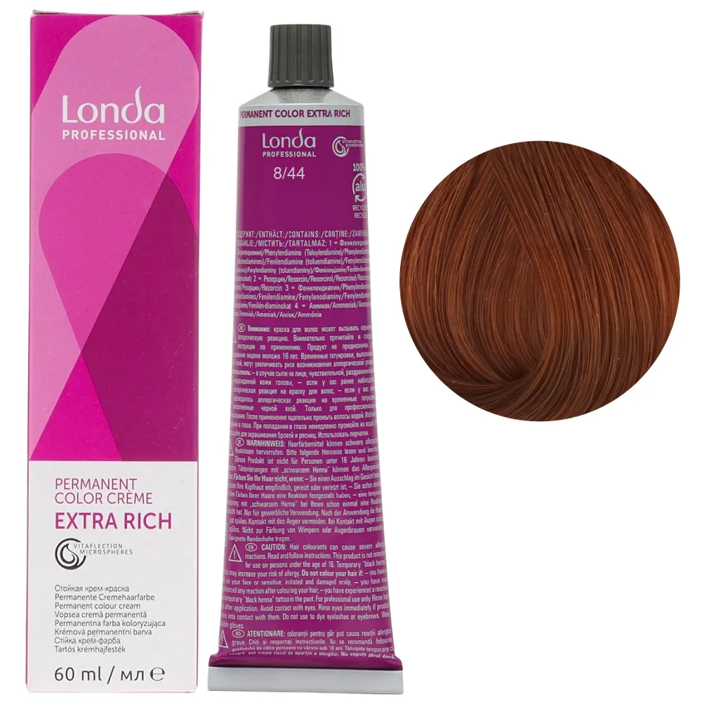 Стійка крем-фарба з мікросферами Vitaflection, які відбивають світло, для стійкого, насиченого життєвою енергією кольору і виняткового блиску волосся. Забезпечує тривалий результат – завдяки спеціальній технології фарба глибоко проникає у структуру волосся, забезпечує інтенсивний колір до 8 тижнів. Має широку палітру понад 100 відтінків для будь-якого типу та кольору волосся. Особливості продукту: 8/44 світлий блондин інтенсивно-мідний Стійка фарба для волосся, 60 мл Permanent Color Londa Professional Фарба має престижну систему ароматів з високоякісним маскуванням аміаку, що робить фарбування більш приємним досвідом для вашого клієнта. Застосування: 8/44 світлий блондин інтенсивно-мідний Стійка фарба для волосся, 60 мл Permanent Color Londa Professional Змішати фарбу Permanent Color з окислювачем Permanent Hair Colour Developer Londacolor 3%, 6%, 9% або 12%. Пропорції змішування: Час витримки залежить від бажаного результату. Важливо! Продукт для професійного застосування. Уважно ознайомтесь з інструкцією.Стійка фарба для волосся Permanent Color Londa Professional
