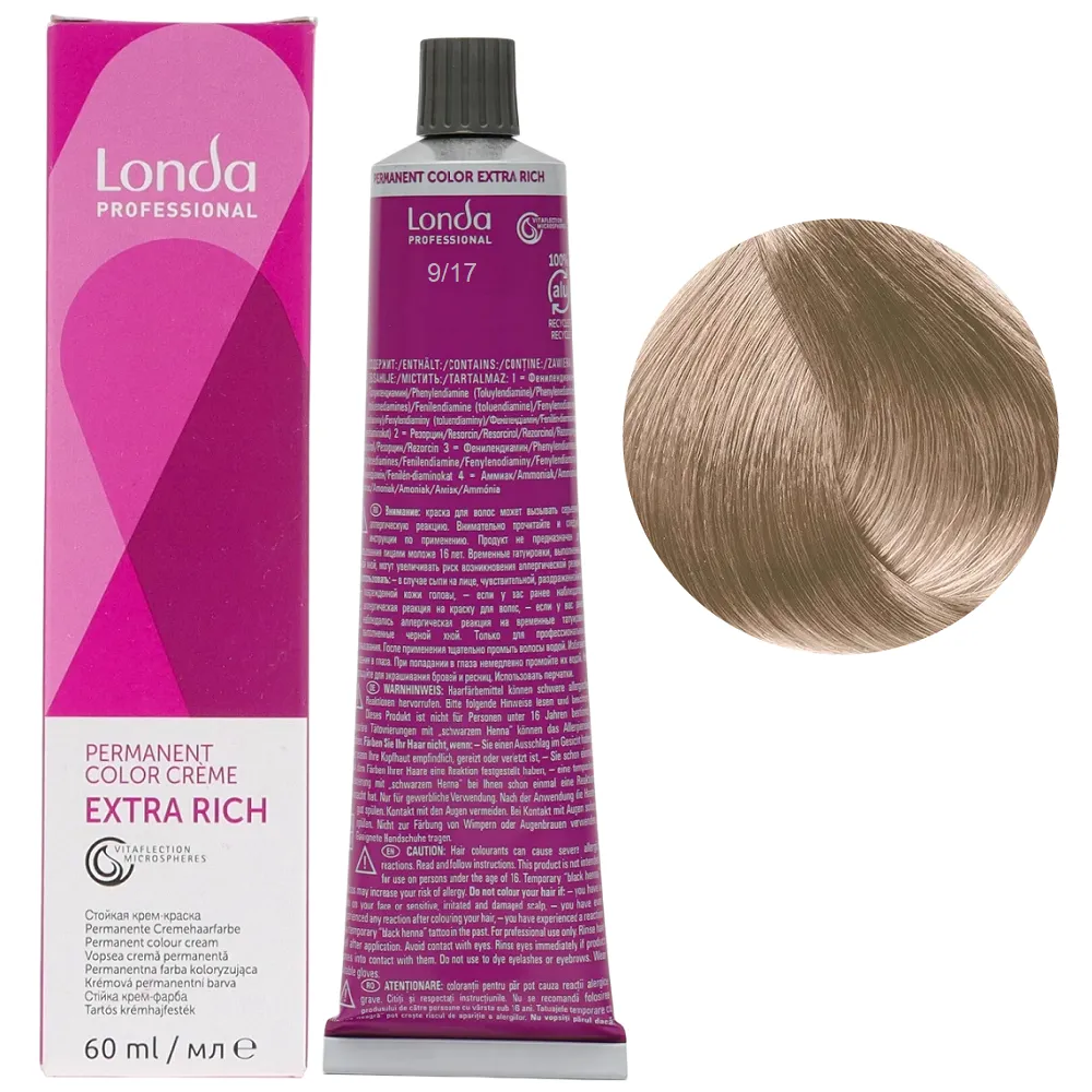 Стійка крем-фарба з мікросферами Vitaflection, які відбивають світло, для стійкого, насиченого життєвою енергією кольору і виняткового блиску волосся. Забезпечує тривалий результат – завдяки спеціальній технології фарба глибоко проникає у структуру волосся, забезпечує інтенсивний колір до 8 тижнів. Має широку палітру понад 100 відтінків для будь-якого типу та кольору волосся. Особливості продукту: 9/17 дуже світлий блондин попелясто-коричневий Стійка фарба для волосся, 60 мл Permanent Color Londa Professional Фарба має престижну систему ароматів з високоякісним маскуванням аміаку, що робить фарбування більш приємним досвідом для вашого клієнта. Застосування: 9/17 дуже світлий блондин попелясто-коричневий Стійка фарба для волосся, 60 мл Permanent Color Londa Professional Змішати фарбу Permanent Color з окислювачем Permanent Hair Colour Developer Londacolor 3%, 6%, 9% або 12%. Пропорції змішування: Час витримки залежить від бажаного результату. Важливо! Продукт для професійного застосування. Уважно ознайомтесь з інструкцією.Стійка фарба для волосся Permanent Color Londa Professional