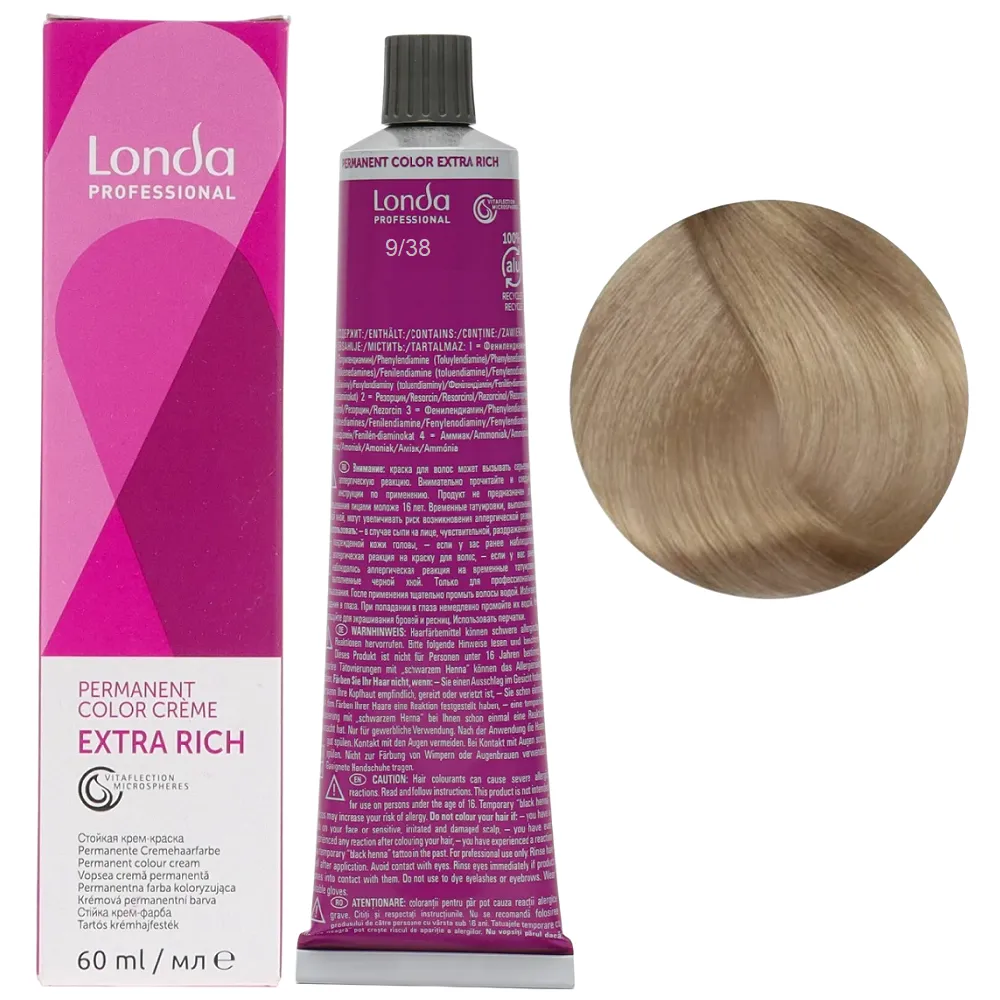 Стійка крем-фарба з мікросферами Vitaflection, які відбивають світло, для стійкого, насиченого життєвою енергією кольору і виняткового блиску волосся. Забезпечує тривалий результат – завдяки спеціальній технології фарба глибоко проникає у структуру волосся, забезпечує інтенсивний колір до 8 тижнів. Має широку палітру понад 100 відтінків для будь-якого типу та кольору волосся. Особливості продукту: 9/38 дуже світлий блондин золотисто-перлинний Стійка фарба для волосся, 60 мл Permanent Color Londa Professional Фарба має престижну систему ароматів з високоякісним маскуванням аміаку, що робить фарбування більш приємним досвідом для вашого клієнта. Застосування: 9/38 дуже світлий блондин золотисто-перлинний Стійка фарба для волосся, 60 мл Permanent Color Londa Professional Змішати фарбу Permanent Color з окислювачем Permanent Hair Colour Developer Londacolor 3%, 6%, 9% або 12%. Пропорції змішування: Час витримки залежить від бажаного результату. Важливо! Продукт для професійного застосування. Уважно ознайомтесь з інструкцією.Стійка фарба для волосся Permanent Color Londa Professional
