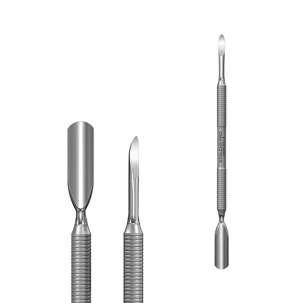 Пушер із пікою SMART 51 TYPE 3 поєднує функціональні зони: Звужений злегка вигнутий кінчик піки зручно застосовувати як у манікюрі, так і педикюрі. Завдяки якісному ручному заточуванню інструмент легко справляється зі щільною шкіркою, не пошкоджуючи структуру нігтя. Цей інструмент виконаний з цілісного металевого полотна, що виключає ризик розхитування деталей чи поломки кріплень. Належить до професійної серії SMART, тому підходить для всіх видів стерилізації і дезінфекції, необхідних у салонних умовах. Особливості продукту: Лопатка манікюрна SMART 51 TYPE 3 (пушер округлений широкий та піка) PS-51/3 STALEKS PROЛопатка манікюрна SMART 51 TYPE 3 STALEKS PRO