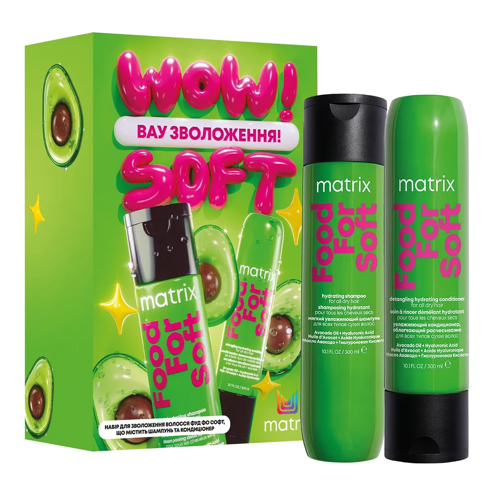 Коли волоссю бракує м’якості й воно здається виснаженим, набір Matrix Food For Soft стає справжнім порятунком. У комплекті — шампунь та кондиціонер, дует, що працює як зволожувальний ритуал. Завдяки поєднанню гіалуронової кислоти та олії авокадо, кожне миття перетворюється на живлення та відновлення. Волосся отримує глибоку вологу, стає в рази м’якшим і залишається таким до 72 годин - без сухості та жорсткості. Набір складається з: Набір для інтенсивного зволоження волосся (шампунь 300 мл + кондиціонер 300 мл), Food For Soft Total Results MATRIX Особливості шампуня Food For Soft : Набір для інтенсивного зволоження волосся (шампунь 300 мл + кондиціонер 300 мл), Food For Soft Total Results MATRIX Особливості кондиціонера Food For Soft : Набір для інтенсивного зволоження волосся (шампунь 300 мл + кондиціонер 300 мл), Food For Soft Total Results MATRIX Застосування: Набір для інтенсивного зволоження волосся (шампунь 300 мл + кондиціонер 300 мл), Food For Soft Total Results MATRIXНабір для інтенсивного зволоження волосся (шампунь 300 мл + кондиціонер 300 мл), Food For Soft Total Results MATRIX