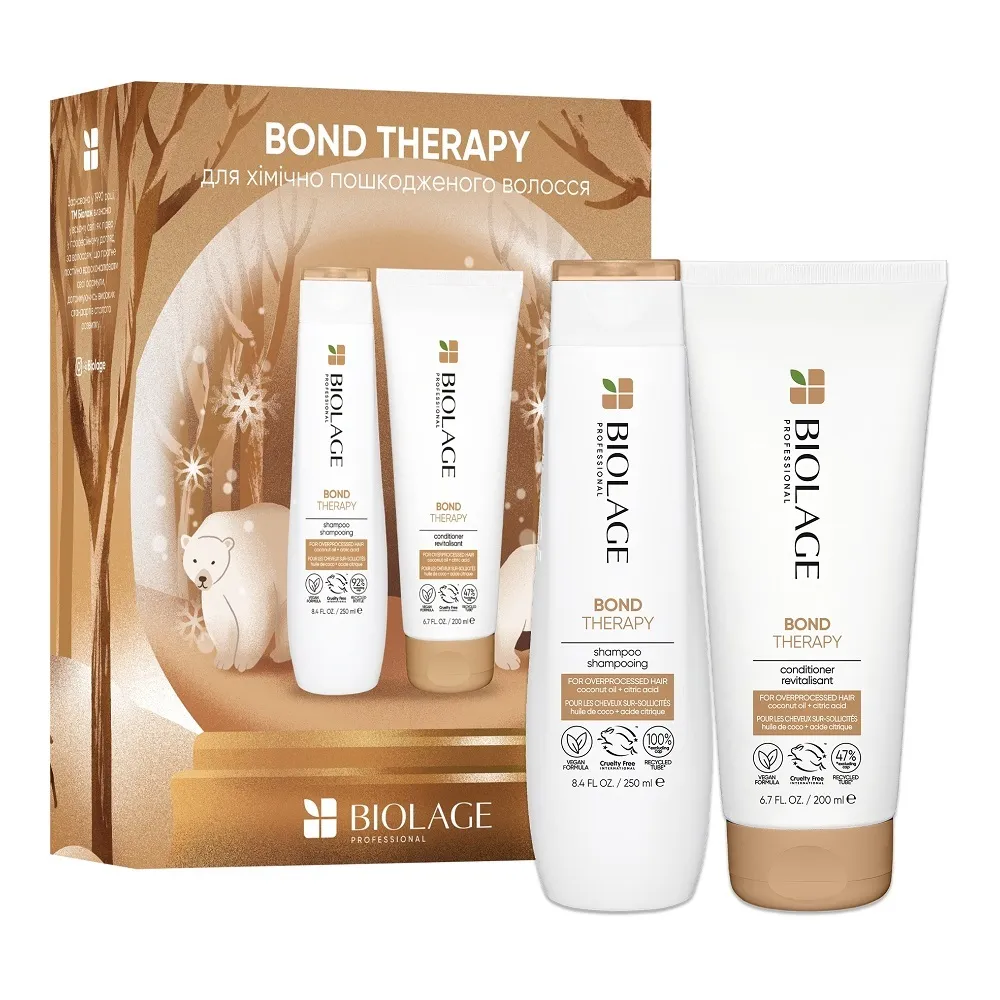 Подаруйте своєму волоссю професійне відновлення з набором BOND THERAPY - створеним спеціально для волосся, яке зазнало хімічного впливу, фарбування або термообробки. Цей комплект не просто доглядає - він реконструює структуру волосся, зміцнює його зсередини й робить більш слухняним уже після першого використання. Ідеальний як для салонного застосування, так і для домашнього ритуалу краси. У наборі: Набір для відновлення волосся (шампунь 250 мл + кондиціонер 200 мл), BOND THERAPY BIOLAGE Professional MATRIX Особливості шампуня Bond Therapy: Набір для відновлення волосся (шампунь 250 мл + кондиціонер 200 мл), BOND THERAPY BIOLAGE Professional MATRIX Особливості кондиціонера Bond Therapy: Набір для відновлення волосся (шампунь 250 мл + кондиціонер 200 мл), BOND THERAPY BIOLAGE Professional MATRIX Застосування: Набір для відновлення волосся (шампунь 250 мл + кондиціонер 200 мл), BOND THERAPY BIOLAGE Professional MATRIXНабір для відновлення волосся (шампунь 250 мл + кондиціонер 200 мл), BOND THERAPY BIOLAGE Professional MATRIX