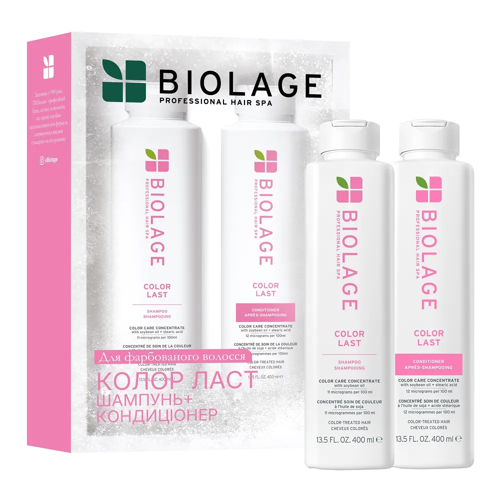 Biolage Color Last - союз догляду та кольору. Якщо ви хочете, щоб фарбоване волосся залишалося яскравим, немов щойно з салону, цей набір стане вашим невід’ємним ритуалом. Формули шампуню та кондиціонера працюють над тим, щоб зберегти насиченість тону, підтримати блиск та надати волоссю силу після впливу фарби. Разом ці продукти не лише фіксують пігмент, але й допомагають волоссю відновитись, зберігають м’якість та природну рухливість. Набір складається з: Набір для захисту фарбованого волосся (шампунь 400 мл + кондиціонер 400 мл), COLOR LAST BIOLAGE Hair Spa MATRIX Особливості шампуня COLOR LAST BIOLAGE: Набір для захисту фарбованого волосся (шампунь 400 мл + кондиціонер 400 мл), COLOR LAST BIOLAGE Hair Spa MATRIX Особливості кондиціонера COLOR LAST BIOLAGE: Набір для захисту фарбованого волосся (шампунь 400 мл + кондиціонер 400 мл), COLOR LAST BIOLAGE Hair Spa MATRIX Застосування: Набір для захисту фарбованого волосся (шампунь 400 мл + кондиціонер 400 мл), COLOR LAST BIOLAGE Hair Spa MATRIXНабір для захисту фарбованого волосся (шампунь 400 мл + кондиціонер 400 мл), COLOR LAST BIOLAGE Hair Spa MATRIX