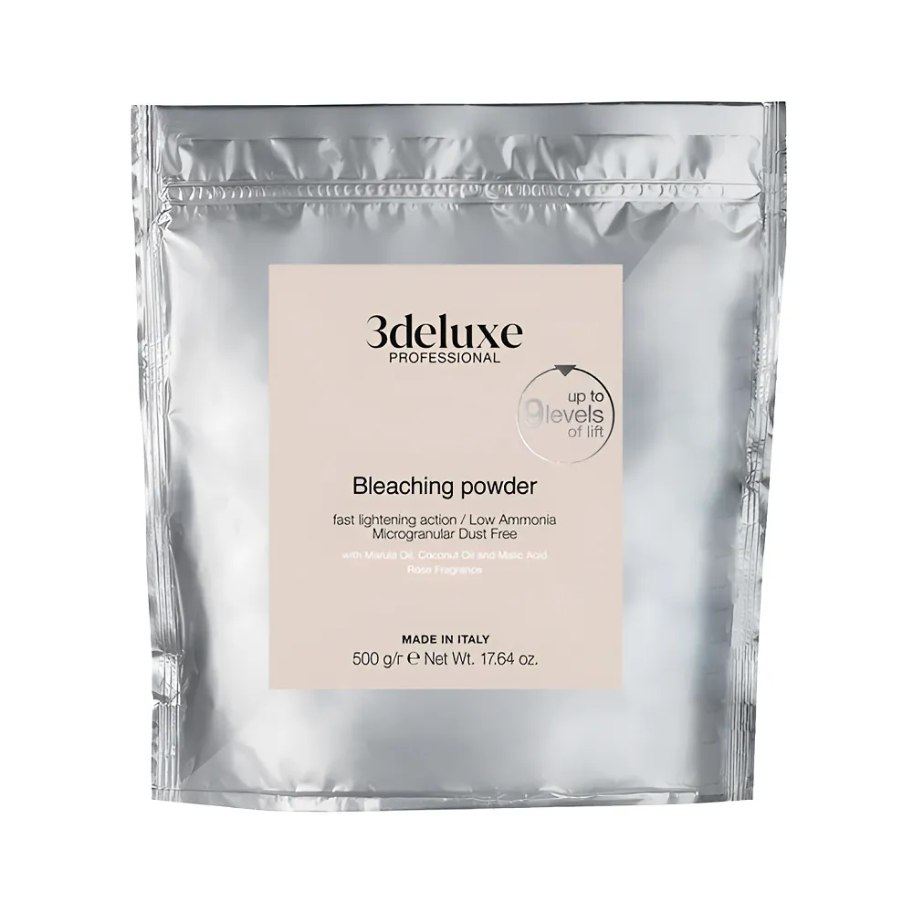 Професійний освітлювач для волосся блакитного кольору Bleaching powder – ідеальне рішення для тих, хто хоче досягти інтенсивного освітлення до 9 рівнів. Завдяки швидкій формулі без пилу та низькому вмісту аміаку, продукт працює ефективно, мінімізує ризик пошкодження волосся. Bleaching powder - це потужний, швидкодієвий, кондиціонувальний відбілювальний порошок. Забезпечує освітлення та одночасно кондиціонує волосся рисовим крохмалем. Особливості продукту: Пудра для знебарвлення волосся (9 levels), 500 г Bleaching powder 3deluxe Professional Активні компоненти: Застосування: Пудра для знебарвлення волосся (9 levels), 500 г Bleaching powder 3deluxe Professional Змішується з окислювачем 1,5%, 3%, 6%, 9% або 12% у пропорції 1:1,5 або 1:2. У пропорції 1:1 застосовується закритий спосіб роботи, пропорції 1:1,5 або 1:2 - відкритий. Час витримки на волосся – до 50 хвилин, при постійному візуальному контролі. Тільки для професійного застосування.Пудра для знебарвлення волосся (9 levels) Bleaching powder 3deluxe Professional