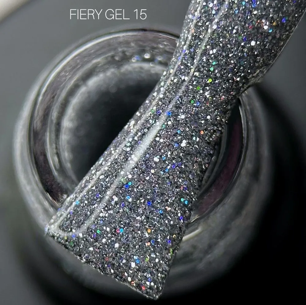 • Колір гель-лак Fiery №15 –  голографічне срібло з додаванням світловідбиваючого мікроблиску та шимеру;