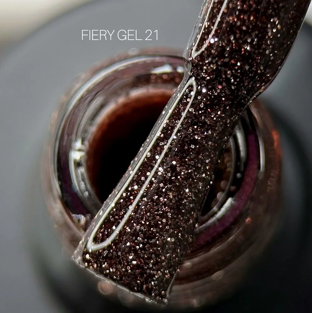 • Колір гель-лак Fiery №21 –  темно-шоколадний з додаванням світловідбиваючого мікроблиску та шимеру;