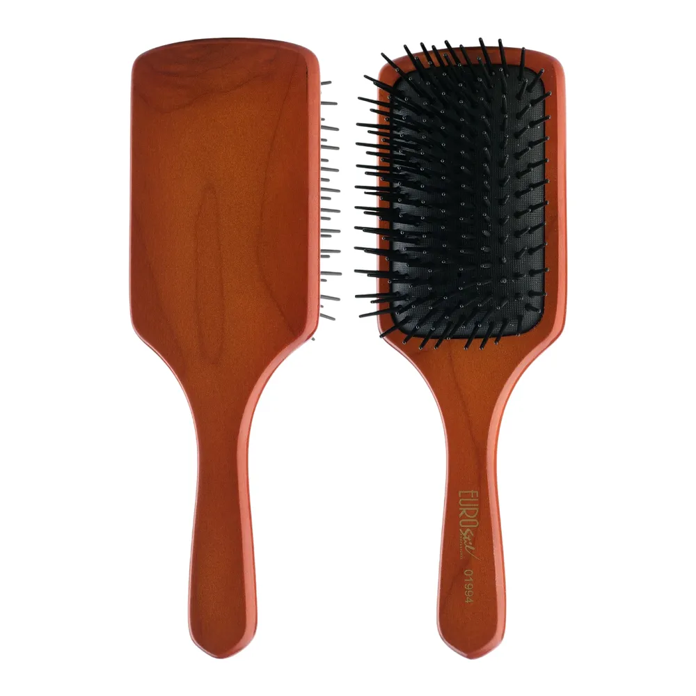 Квадратна дерев`яна масажна щітка для волосся Eurostil Paddle Brush - зручний аксесуар для домашнього та салонного застосування. Завдяки зручній формі, легкій вазі та добре збалансованій ручці виріб комфортно тримати у руці. Такий гребінець стійкий до різних температурних режимів, тому нею можна користуватися під час термопроцедур. Особливості продукту: Щітка масажна для волосся Paddle дерев`яна квадратна 01994 EurostilЩітка масажна для волосся Paddle дерев`яна квадратна 01994 Eurostil