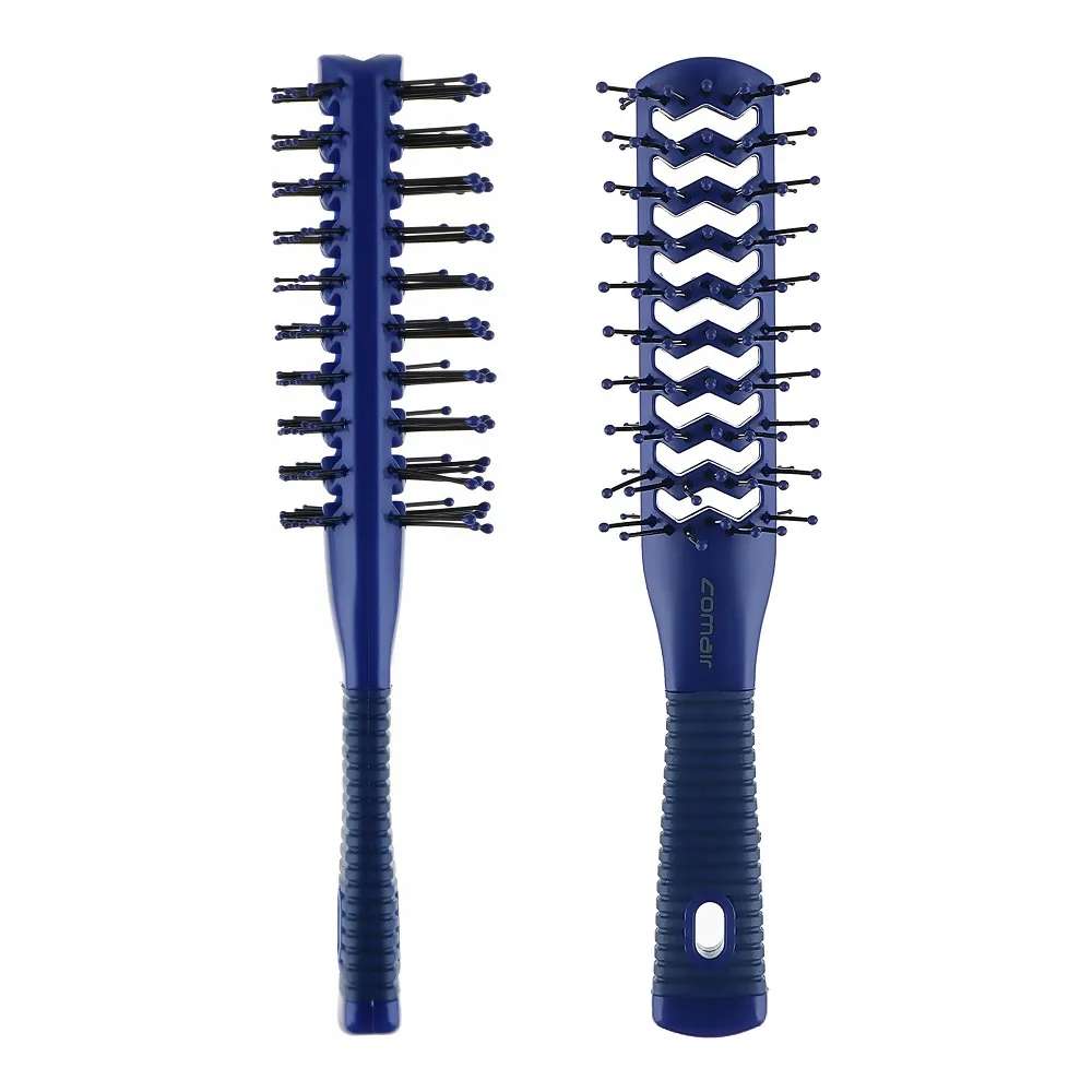 Професійна тунельна щітка Comair Germany, артикул 3020637, синього кольору, призначена для ефективної укладки й догляду за волоссям. Вона має двозарядну (двосторонню) конструкцію з довгими й короткими зубцями, що дозволяє одночасно розплутувати пасма і надавати прикореневий об’єм. Ручка оснащена прогумованою поверхнею, яка запобігає ковзанню в руці, а матеріал корпусу відзначається високою стійкістю до термічних впливів - підходить для роботи з феном. Ця щітка стане чудовим вибором для щоденного укладання, створення об’єму біля коріння і швидкого сушіння без шкоди для волосся.Щітка тунельна двостороння (синя) 3020637 Comair Germany