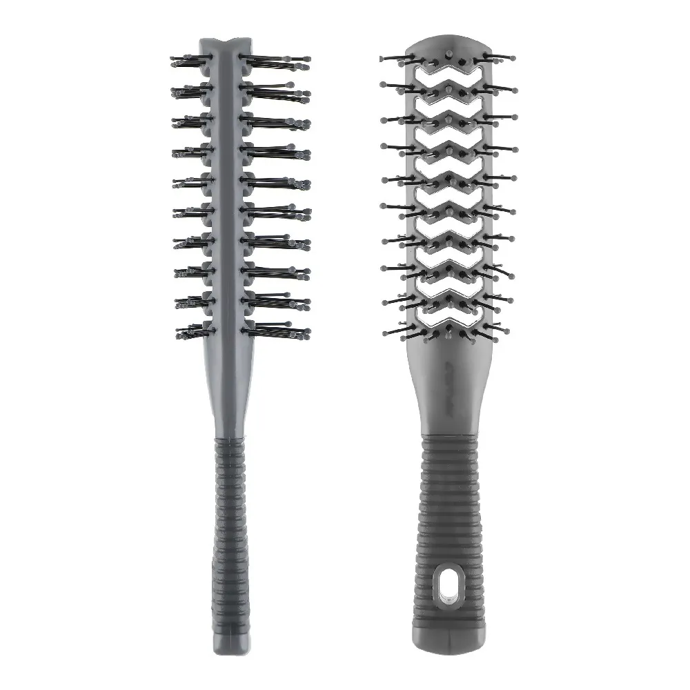 Професійна тунельна щітка Comair Germany, артикул 3020647, сріблясто-сірого кольору, призначена для ефективної укладки й догляду за волоссям. Вона має двозарядну (двосторонню) конструкцію з довгими й короткими зубцями, що дозволяє одночасно розплутувати пасма і надавати прикореневий об’єм. Ручка оснащена прогумованою поверхнею, яка запобігає ковзанню в руці, а матеріал корпусу відзначається високою стійкістю до термічних впливів - підходить для роботи з феном. Ця щітка стане чудовим вибором для щоденного укладання, створення об’єму біля коріння і швидкого сушіння без шкоди для волосся.Щітка тунельна двостороння (сріблясто-сіра) 3020647/721059 Comair Germany