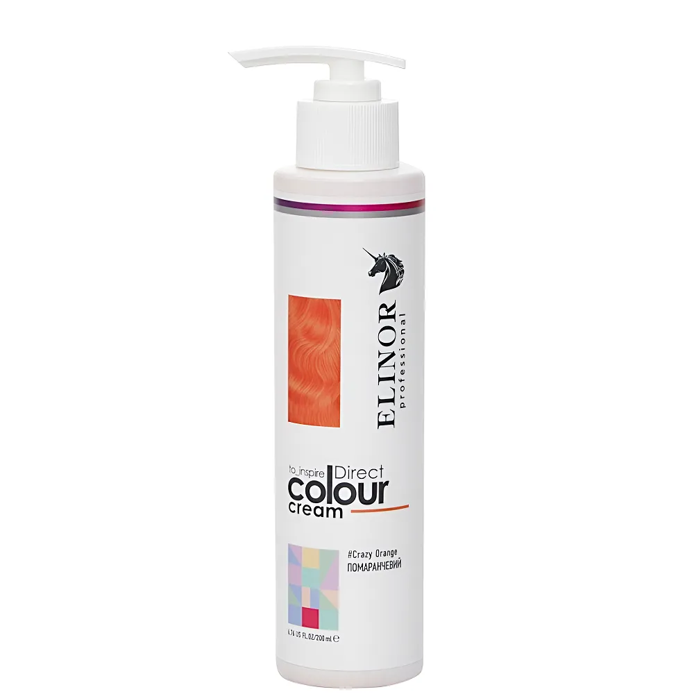 Direct Colour Cream — професійний тонувальний крем прямої дії, розроблений для створення яскравих відтінків на знебарвленому або освітленому волоссі. На натуральному темному волоссі може дати легкий відблиск при денному світлі, особливо на сонці, але не дає інтенсивного тону без попереднього освітлення. Допомагає тимчасово змінити образ без стійкого фарбування та підходить для створення акцентних кольорових ефектів або повного тонування. Формула крему не містить аміаку та забезпечує не лише яскравий кольоровий ефект, але й додатковий догляд. Засіб збагачений активними компонентами, які зволожують, пом’якшують і захищають волосся під час тонування. Стійкість кольору до 6–15 миттів голови, залежно від типу волосся та засобів догляду. Частково тонуватиме сивину, але не повністю перекриє. Особливості продукту: Тонувальний крем для волосся прямої дії (колір: ПОМАРАНЧЕВИЙ/Crazy Orange), 200 мл Direct Colour Cream ELINOR Professional Застосування: Тонувальний крем для волосся прямої дії (колір: ПОМАРАНЧЕВИЙ/Crazy Orange), 200 мл Direct Colour Cream ELINOR Professional Зручний у використанні, не потребує окислювача, ідеально наносити на висвітленні пасма. Можна експериментувати і додавати в улюблену маску для підтримання кольору.Тонувальний крем для волосся прямої дії Direct Colour Cream ELINOR Professional