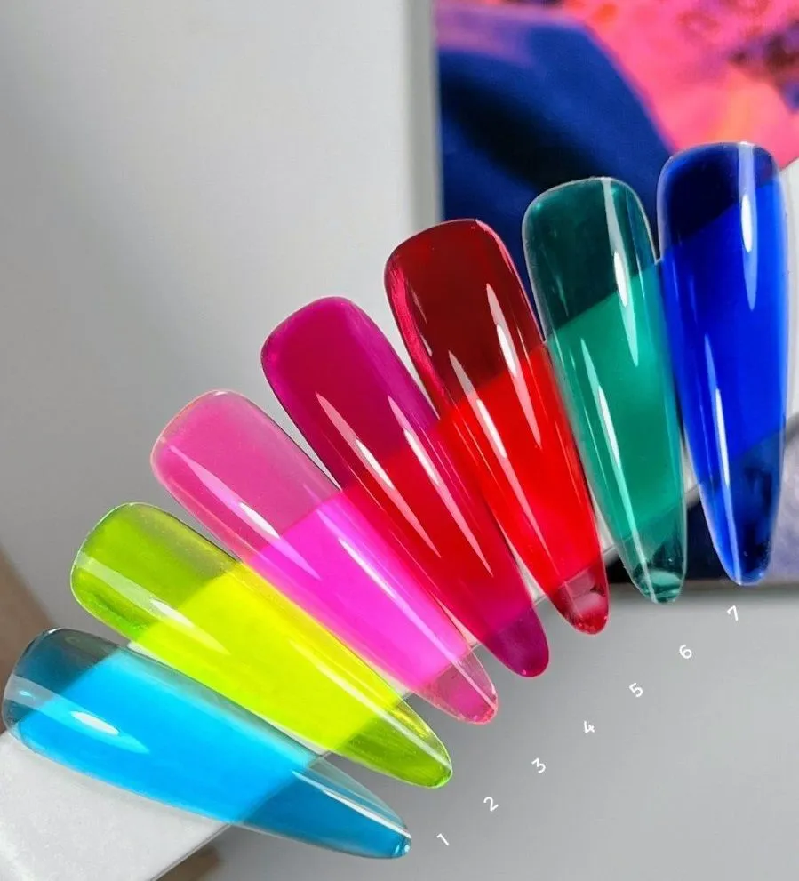 Топи з вітражним ефектом надає манікюру на нарощених і натуральних нігтях скляне сяйво, завдяки низькому вмісту пігментів. Їх прозора формула