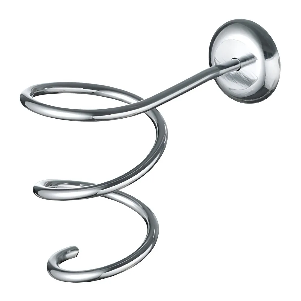 Comair Тримач для фена "Spirale" 3160034/764075 - настінний держатель для фена, підходить для професійного салонного використання. Виготовлений із хромованого металу, що надає йому привабливого вигляду та захищає від корозії під час дії вологи або хімічних засобів. Підходить для всіх професійних фенів із довгим соплом, забезпечуючи надійну фіксацію та зручність у роботі. Кріплення приховується під накладкою, завдяки чому тримач має охайний і професійний вигляд у салонному інтер’єрі. Діаметр: 8,5 см.Тримач для фена спіральний Spirale 3160034/764075 Comair Germany