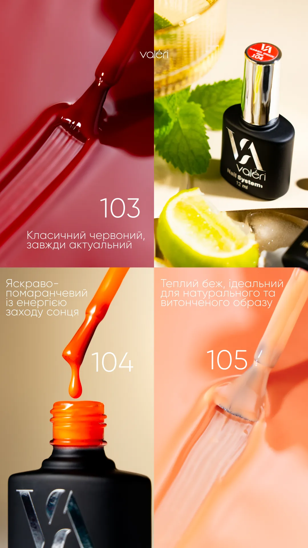 Valeri Summer Breeze Base Collection - використовуються як основний колір покриття та забезпечують зручність та швидкість роботи майстра. Бази для манікюру доступні у різних відтінках, що дозволяє підібрати колір, що найбільше пасує вашим клієнтам. Не потребують опилу після просушки. Необхідно наносити підложку із Rubber Base. Технологія нанесення: 1.Підготуйте нігтьову пластину: зніміть попереднє покриття, забафте, зробіть опил форми та манікюр. 2.Обезжирте нігтьову пластину та нанесіть безкислотний праймер Valeri Ultrabond (за потребою кислотний). 3.Нанесіть та просушіть підложку із Valeri Rubber Base. Обраним номером бази із світловідбиваючій колекції нанесіть вирівнюючим шаром та просушіть у лампі UV/LED лампі 2хв./30 сек. Інтенсивність покриття можна регулювати за рахунок кількості нанесених тонких шарів бази. 4.Закріпити покриття топом та просушити у UV/LED лампі 2хв./30 сек. При використанні фінішного покриття Valeri Rubber Top зняти дисперсійний шар за допомогою клінсера або cпеціального засобу Prep&Finish Склад: Epoxy Acrylate Oligomer, Urethane Acrylate Oligomer, 1-Hydroxyethyl methacrylate, 1-Hydroxycyclohenyl phenyl ketone, Bis (Methacryloxyethyl) Phosphate