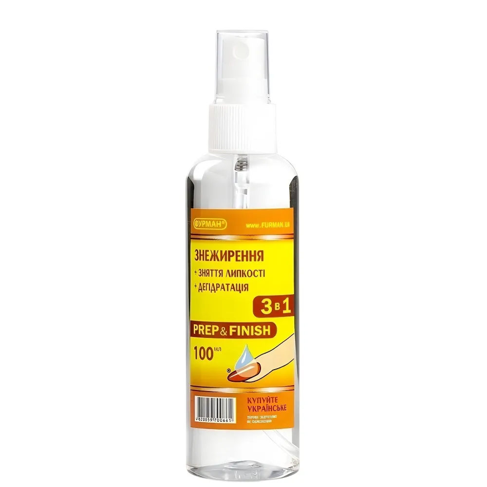 Засіб 3 в 1 Prep&Finish допоможе підготувати нігтьові пластини до нанесення базового шару гель-лаку та зняти липкість після полімеризації під ультрафіолетовим апаратом. Рідина добре прибере жир, воду та забруднення з нігтя і допоможе позбутися дисперсійного шару, коли манікюр чи педикюр вже закінчено. Особливості продукту: Засіб для знежирення і зняття липкості, дегідратації 3 в 1, 100 мл Prep&Finish ФУРМАН Застосування: Засіб для знежирення і зняття липкості, дегідратації 3 в 1, 100 мл Prep&Finish ФУРМАН Рухайтеся від кутикули до краю.Засіб для знежирення і зняття липкості, дегідратації 3 в 1 Prep&Finish ФУРМАН